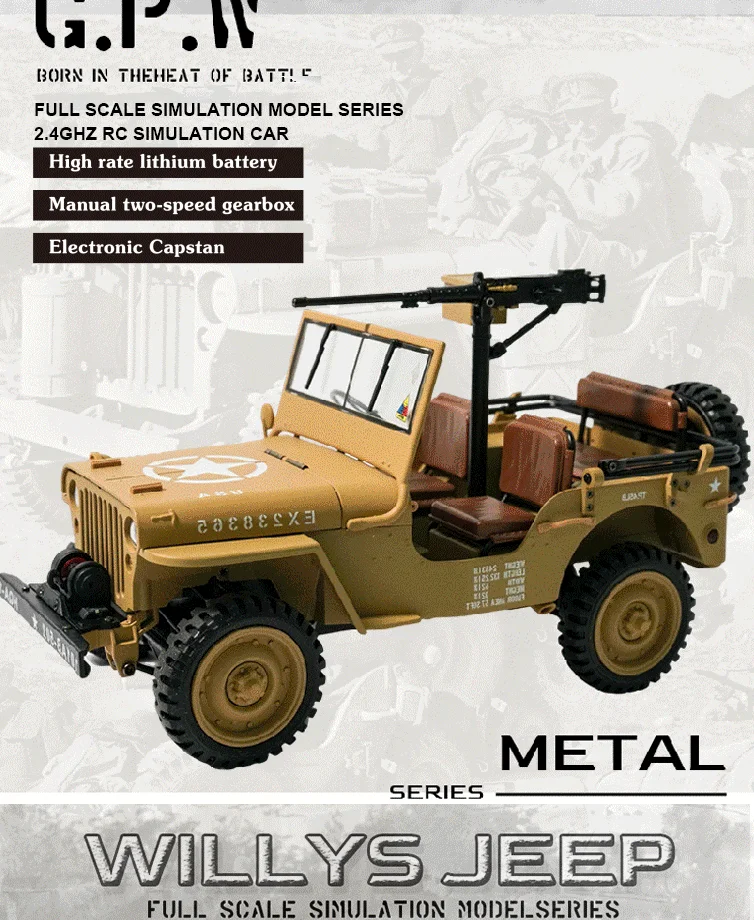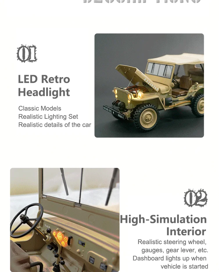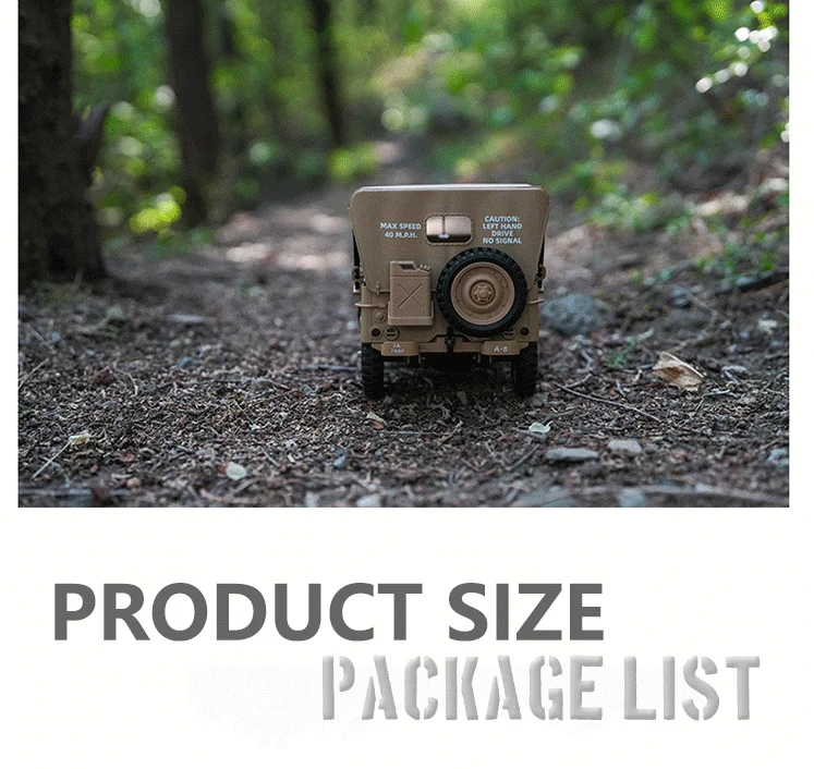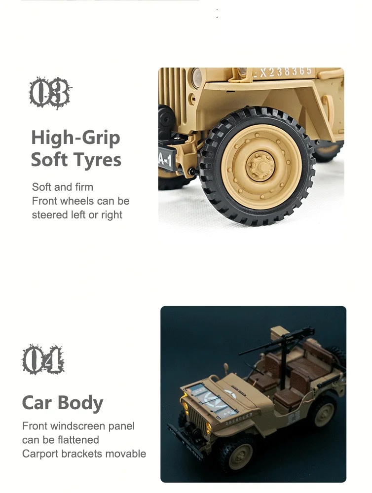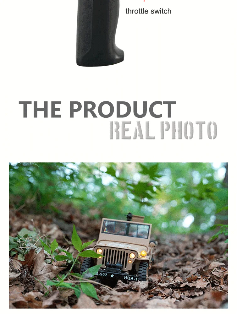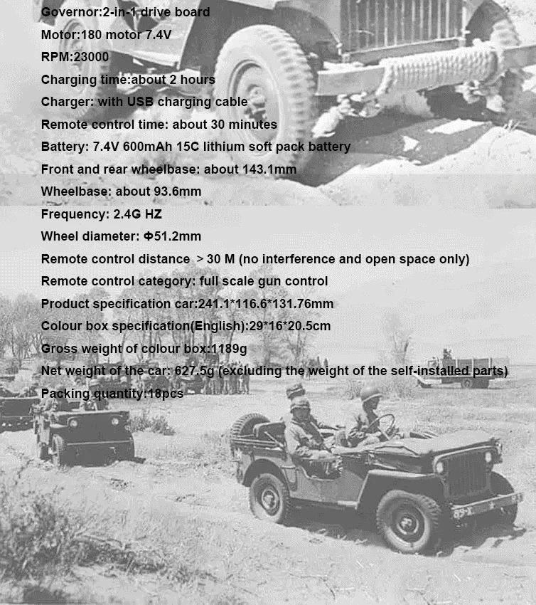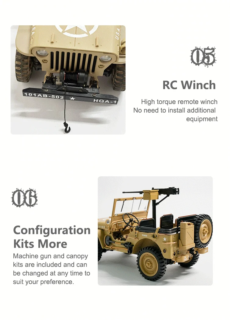 Full proportional control functions for forward, reverse, left and right steering, lights, sounds, alloy frame chassis and drive shaft, four-wheel drive, the dashboard will light up after the vehicle is started, high-torque remote control winch can bear 500 grams, the front windshield can be laid flat, manual two-speed mechanical transmission, alloy wheel hub, alloy drive shaft, shock-absorbing alloy, two-speed manual transmission (1:33/1:99), metal transmission rod, all-metal gear transmission, 9g digital servo