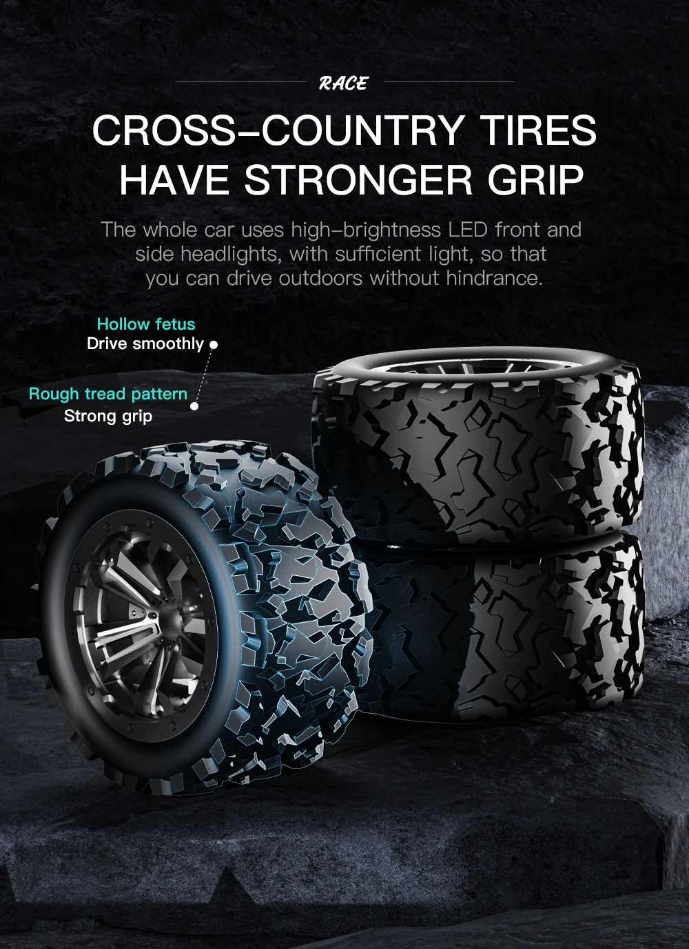 - Off-Road Simulation Tires: Thick, anti-slip tires with strong grip, designed for all-terrain adventures — on dirt, gravel, grass, or pavement. The rugged design ensures durability and excellent traction.
