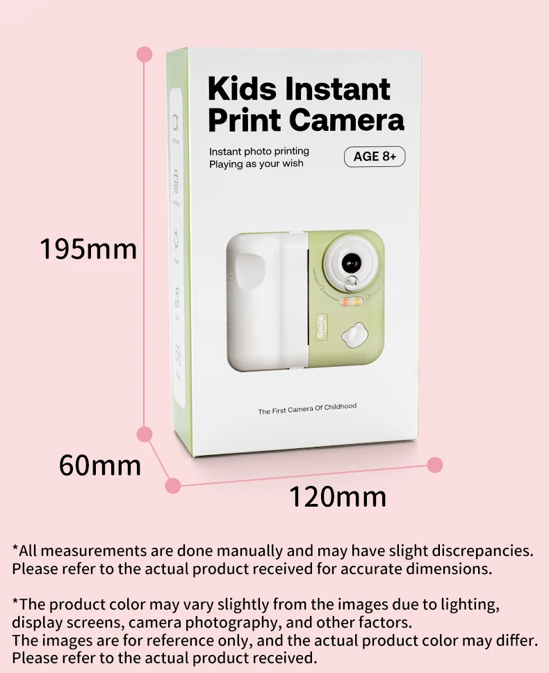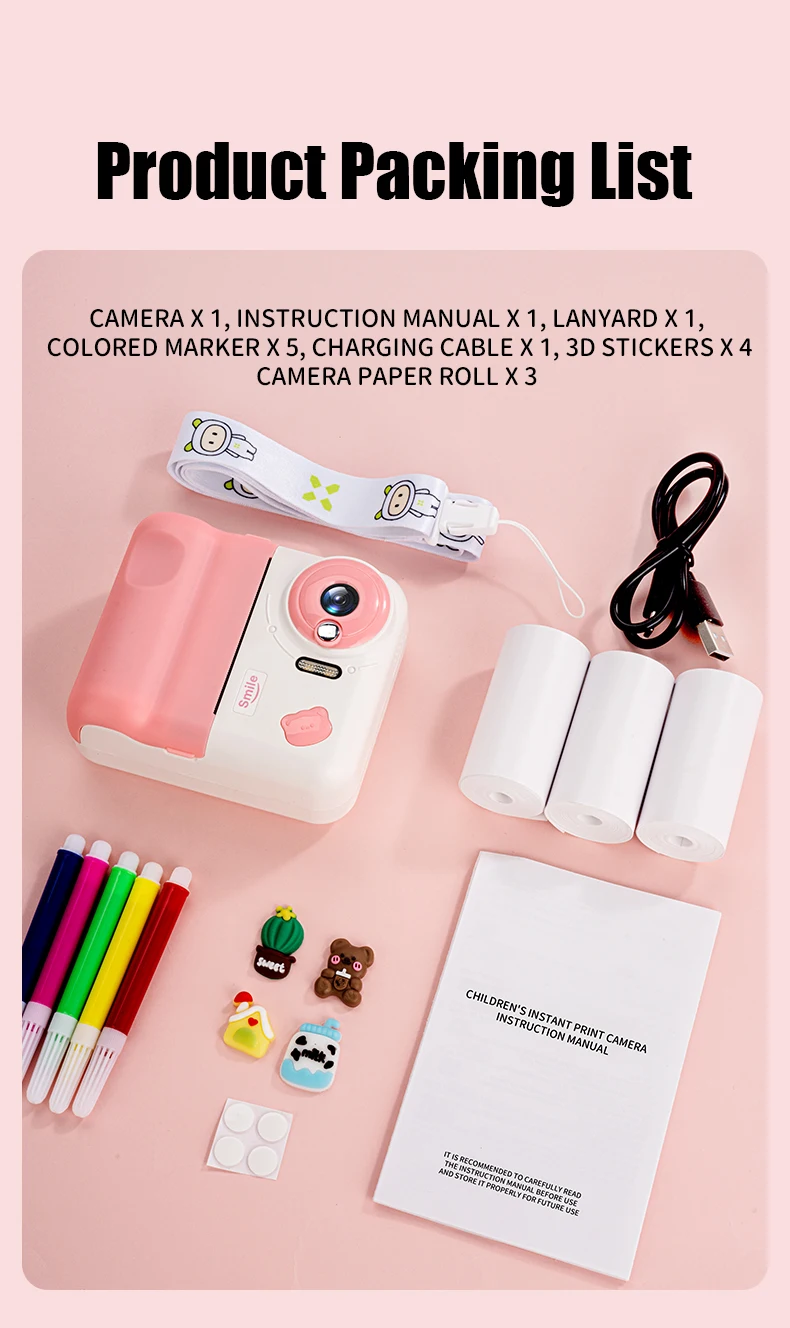 Camera*1, Manual*1, Lanyard*1, Color Pen*5, Charging Cable*1, Stereo Stickers*4, Camera Paper Roll*3
