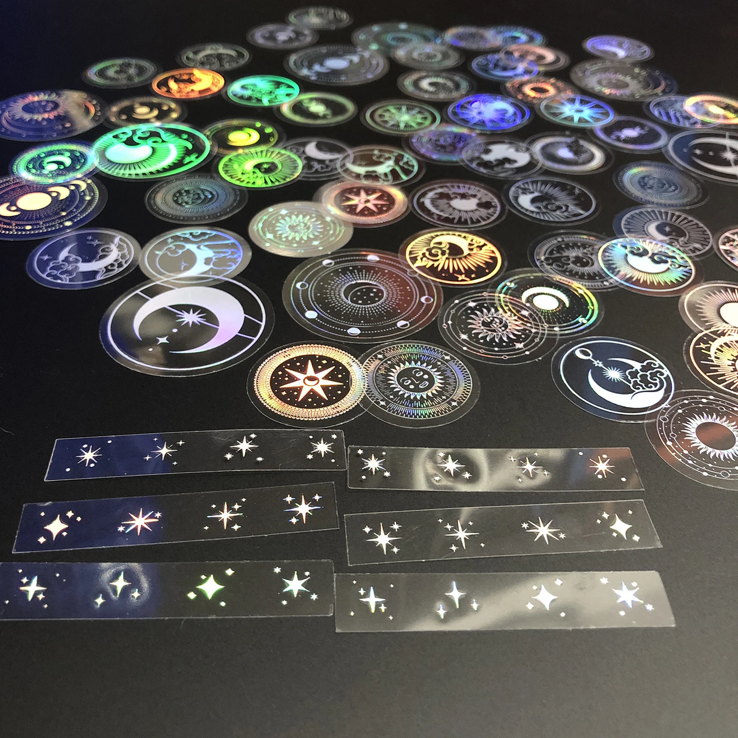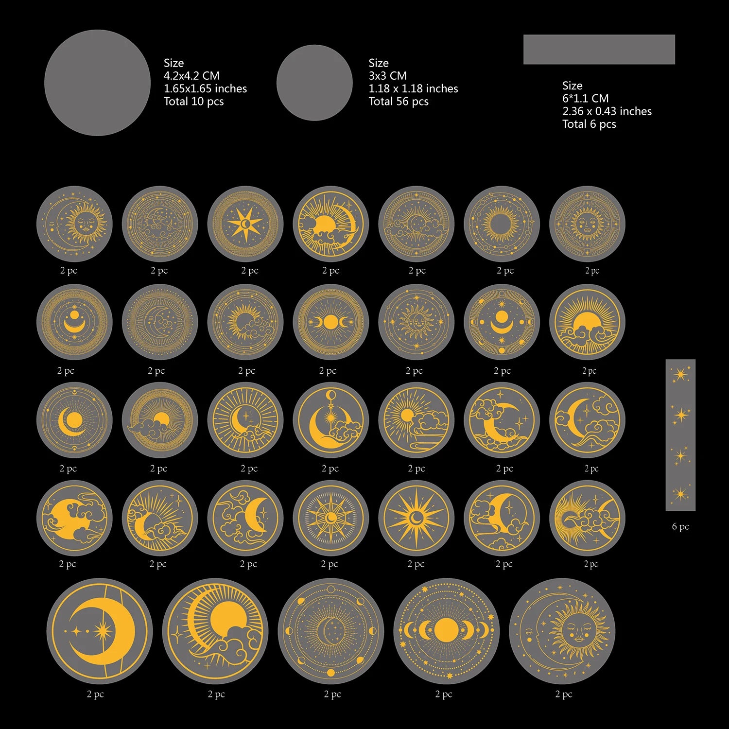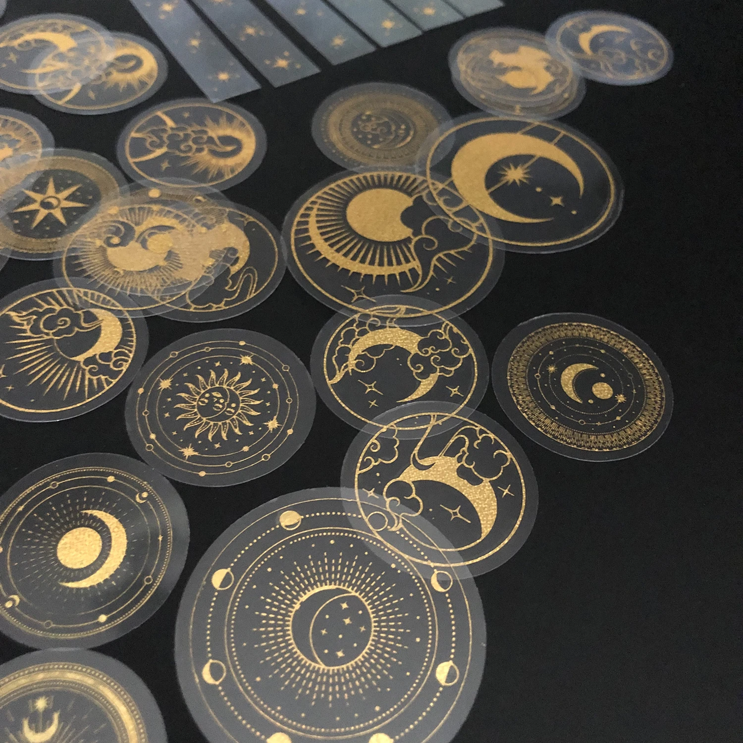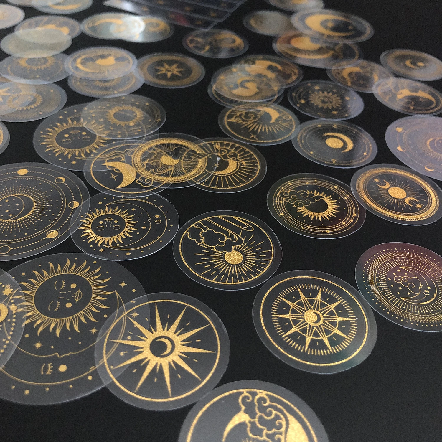 EZ 70 pcs Glitter Gold PET Adhesive Stickers Waterproof Transparent Label: SUN MOON Stars etc