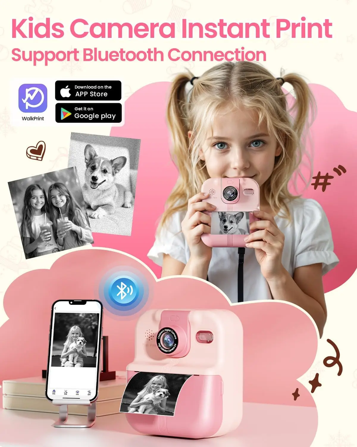EZ Bluetooth Kids Camera Instant Print Photo 1080P Mini Toddler Camera for Boys Girls DIY Instant Print Toys With 32G SD Card