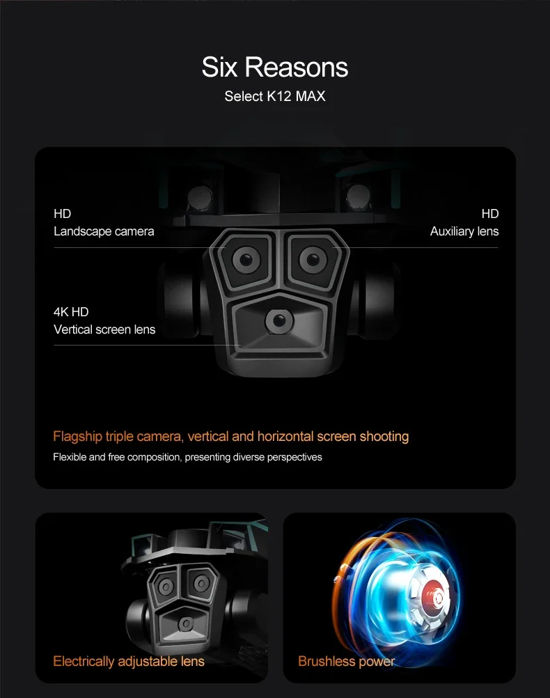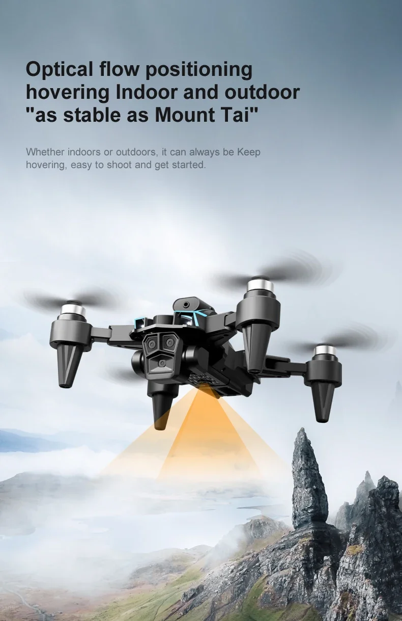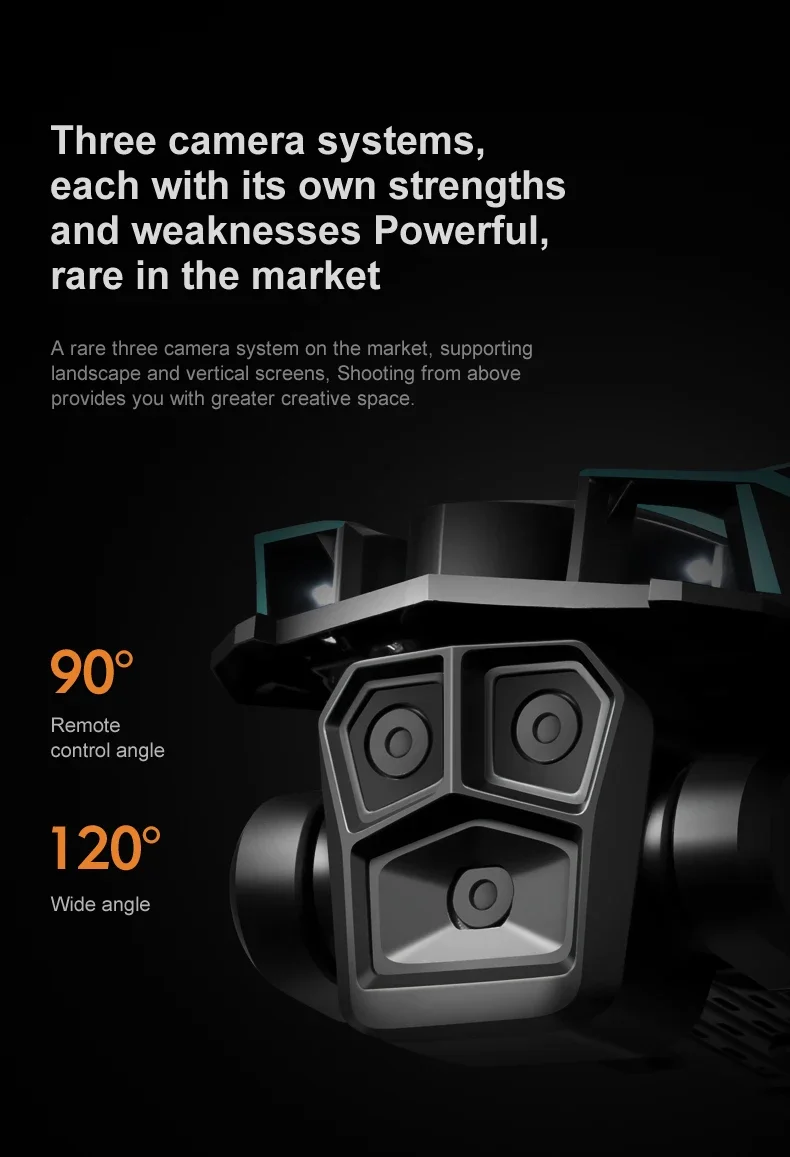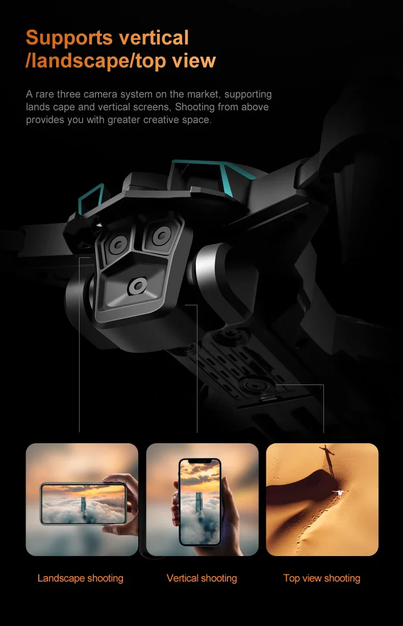 1. The front lens is placed with wide-angle 4K high-definition WIFI, the bottom high-definition lens with optical flow can switch the camera angle, the servo pan tilt is designed to increase stability, and the EIS electronic anti shake is added to make the photo line clearer