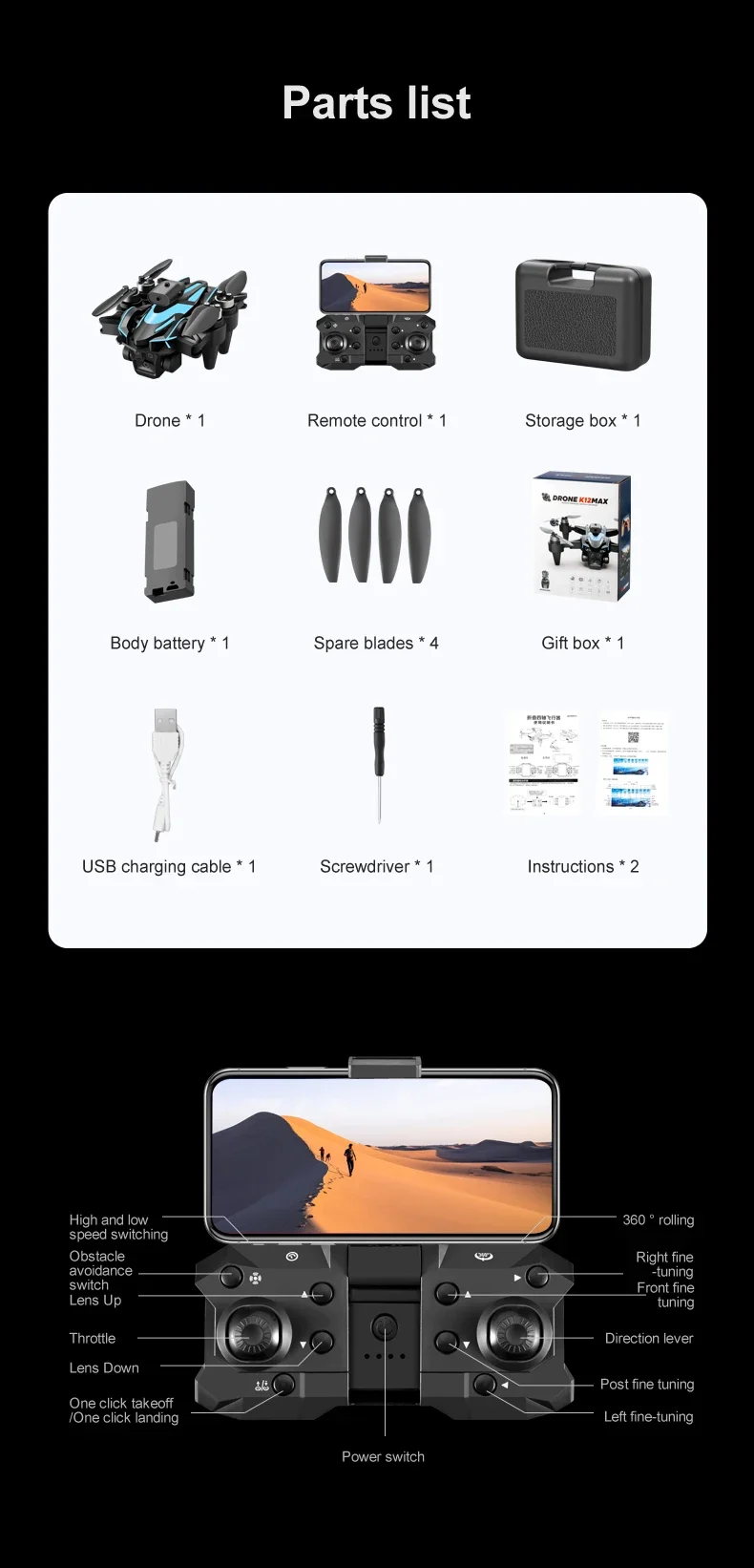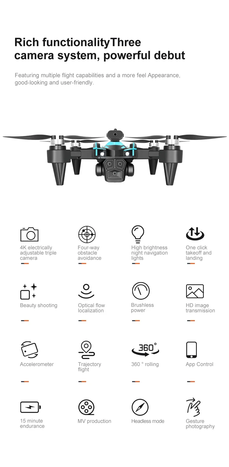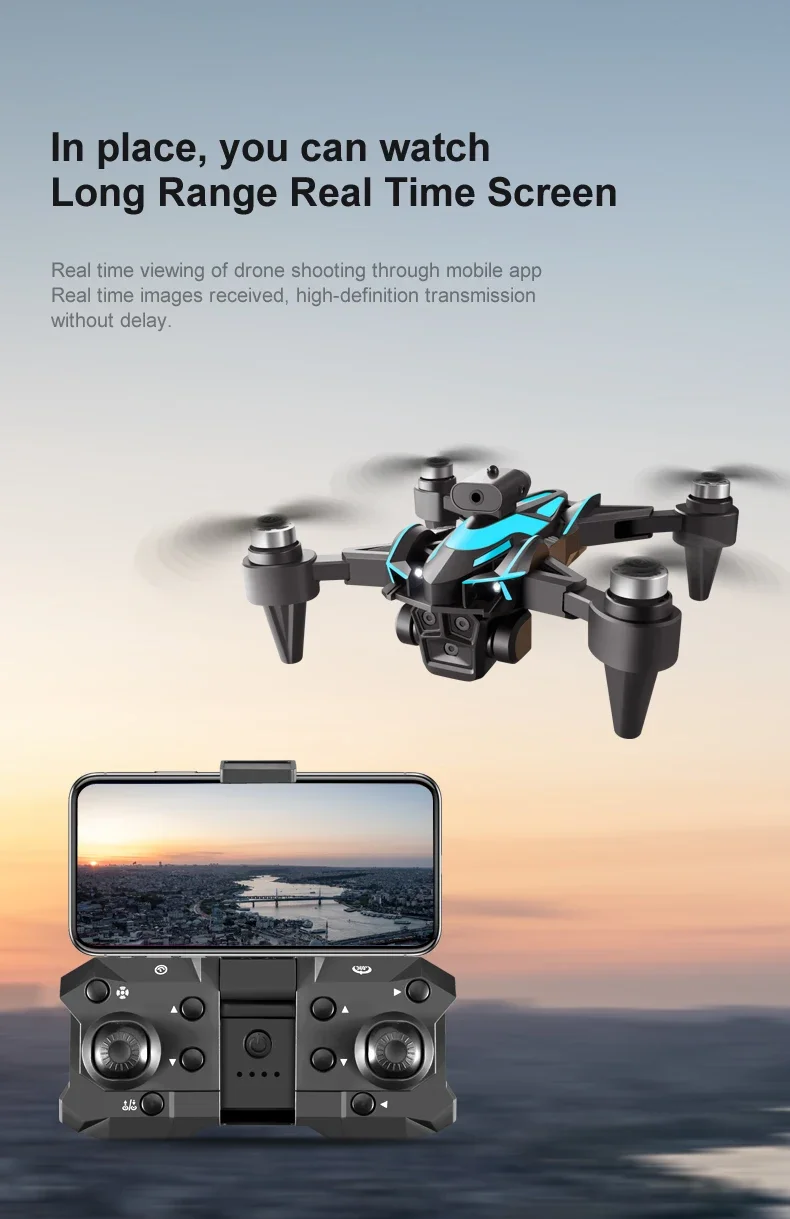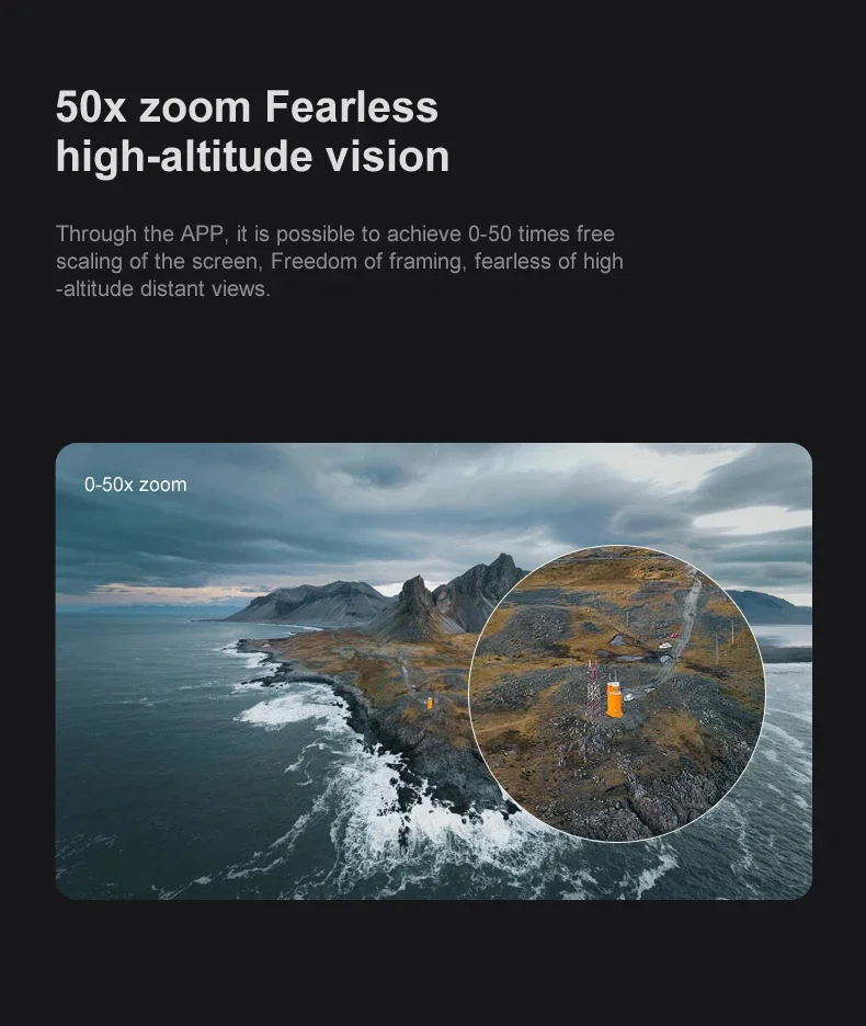 1. The front lens is placed with wide-angle 4K high-definition WIFI, the bottom high-definition lens with optical flow can switch the camera angle, the servo pan tilt is designed to increase stability, and the EIS electronic anti shake is added to make the photo line clearer