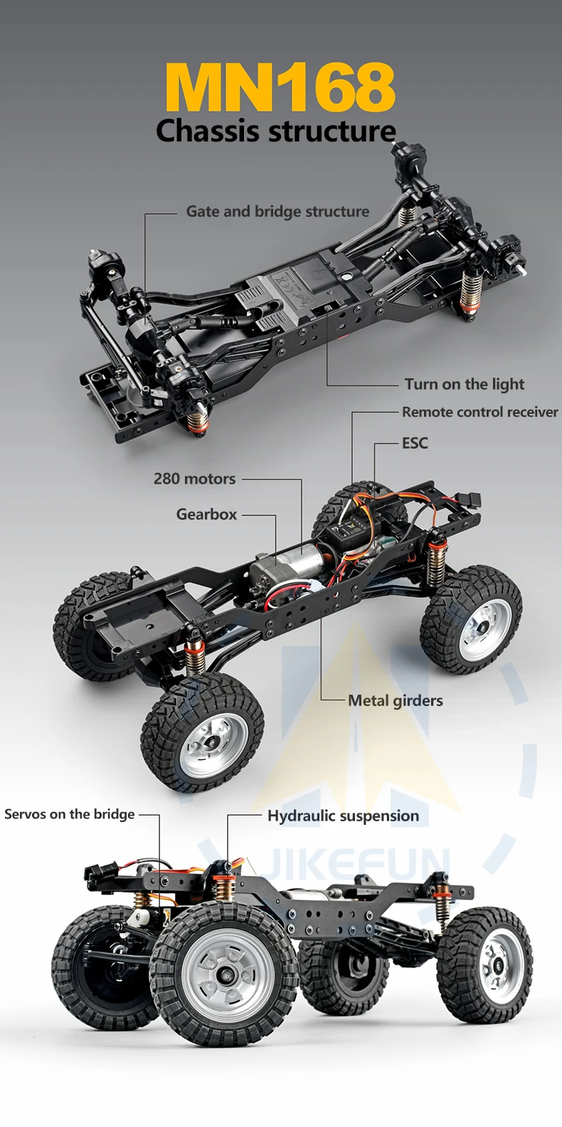 Function: Forward, backward, left turn, right turn, proportional remote control, two-stage transmission, with drag braking function, remote control to control the headlights