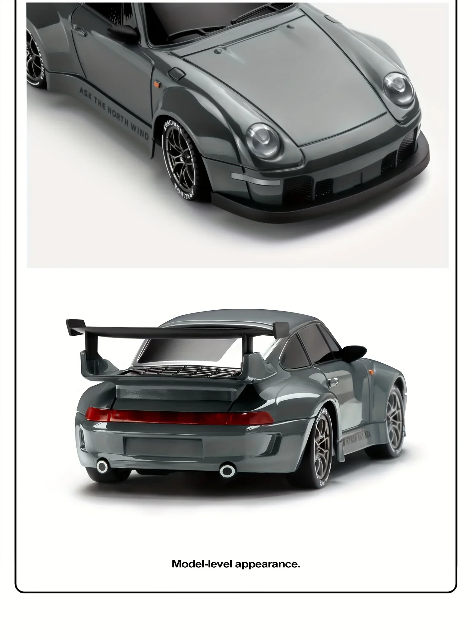 4WD RC Dirft Car: This 1:24 scale drift car combines classic model architecture with futuristic design elements. Featuring a high-toughness PVC body and streamlined silhouette, it integrates LED lighting system (Equipped with headlights and taillights) to enhance nighttime visibility while doubling as an artistic display piece when stationary.